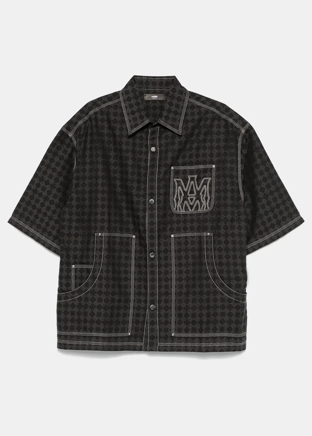 Cotton-linen blend work shirt in black. Front press-stud fastening Chest patch pocket Two rounded pockets to the sides Embroidered logo 82% Cotton 18% Linen Made in Italy.