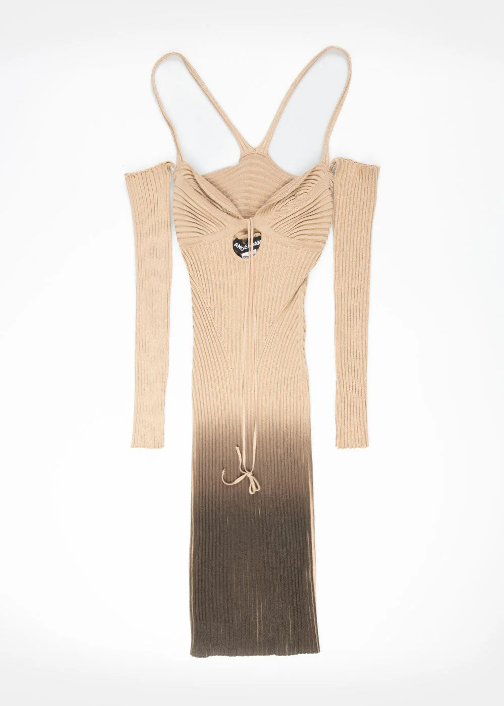 Printed ribbed mini dress in beige. 80% Viscose, 10% Polyester, 9% Polyamide, 1% Spandex/Elastane. Made in Italy.