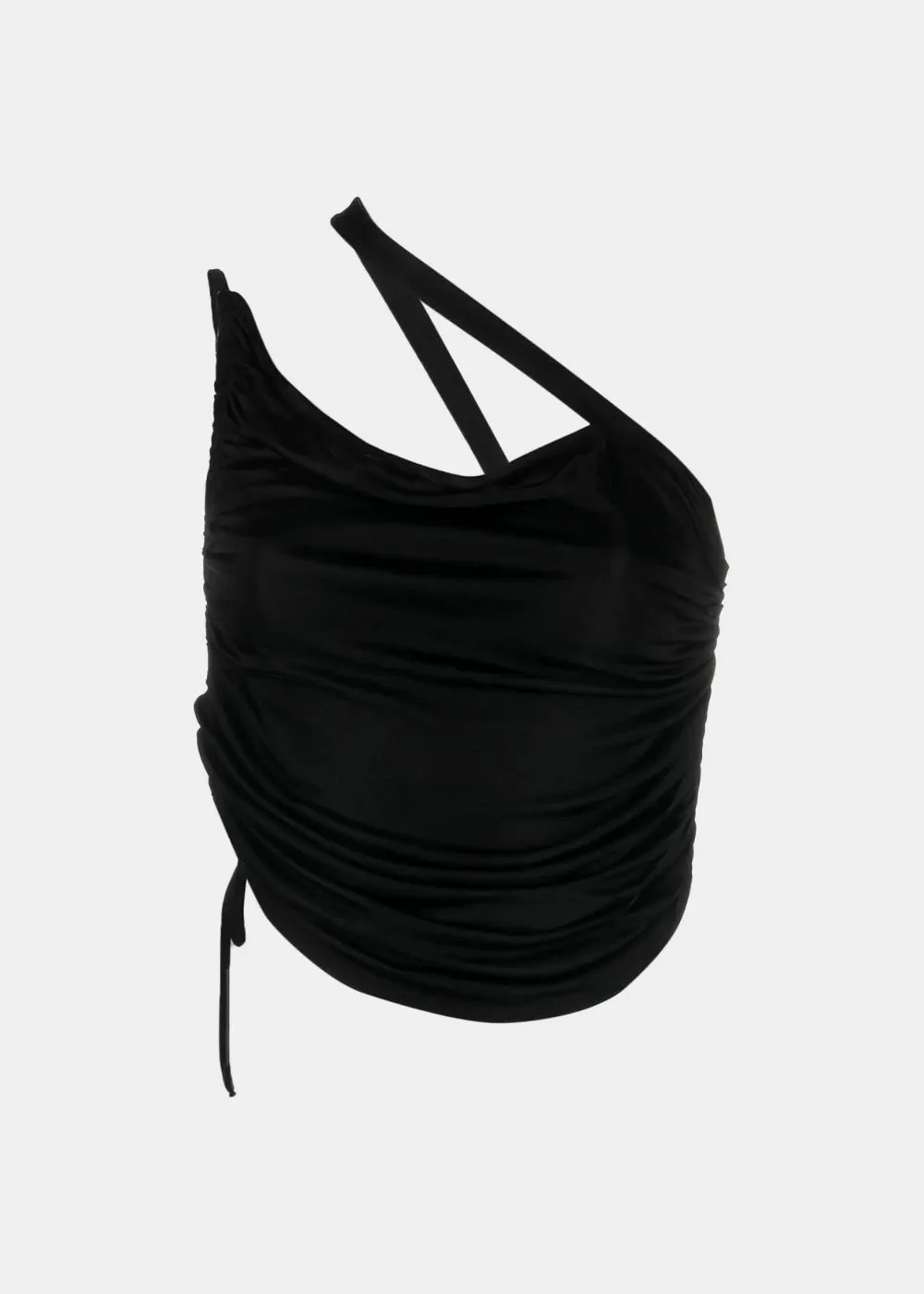 Viscose draped top in black with side lace-up fastening. One-shoulder Curved hem Cropped 100% Viscose. Made in Italy.