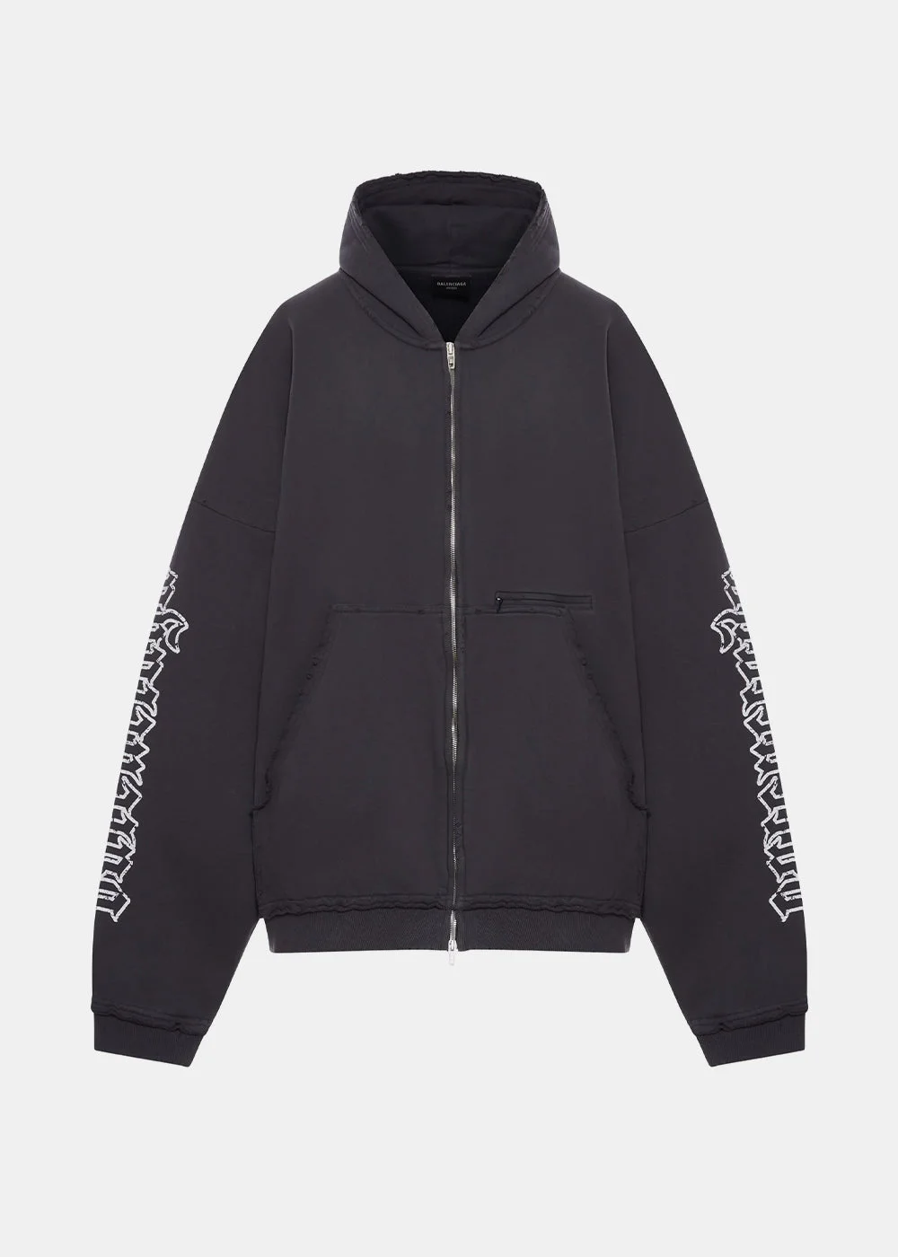 Blackletter Script Pulled Zip-up Hoodie Large Fit in Black Faded