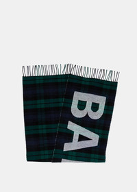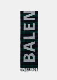 Scarf in navy/dark green tartan. Large Balenciaga logo print in white. Fringed ends. 100% Wool. Made in Italy.