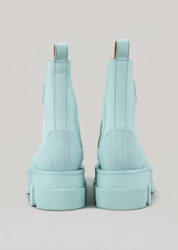 Mid-calf calfskin Platform Chelsea boots in light blue. Round toe. Tonal elastic gusset at sides. Calfskin pull-loop at collar. Tonal buffed calfskin lining. Textured tonal rubber midsole and outsole. Approx. 6.5 cm heel. Upper: 80% Nylon PU, 20% Rubber. Lining: 100% Calf Leather. Outsole: 70% EVA, 30% Rubber. Made in China.