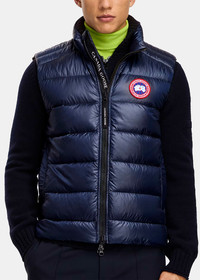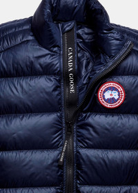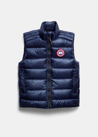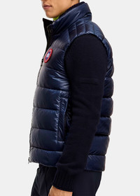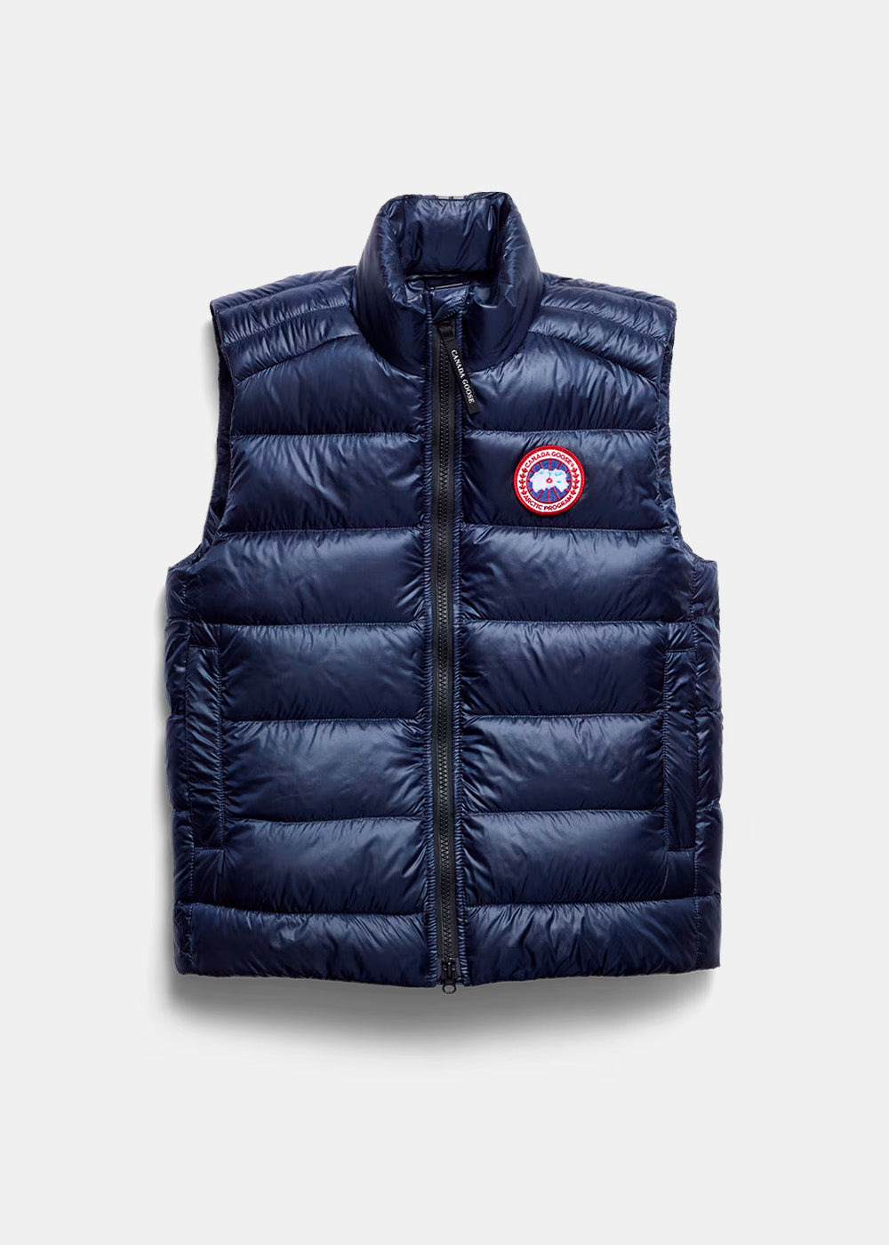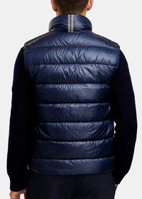 Crofton padded down gilet in navy blue. Logo patch to the front Padded design Two side zip-fastening pockets Sleeveless Front zip fastening 100% Recycled Nylon Made in Canada.