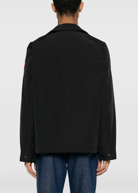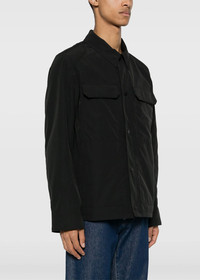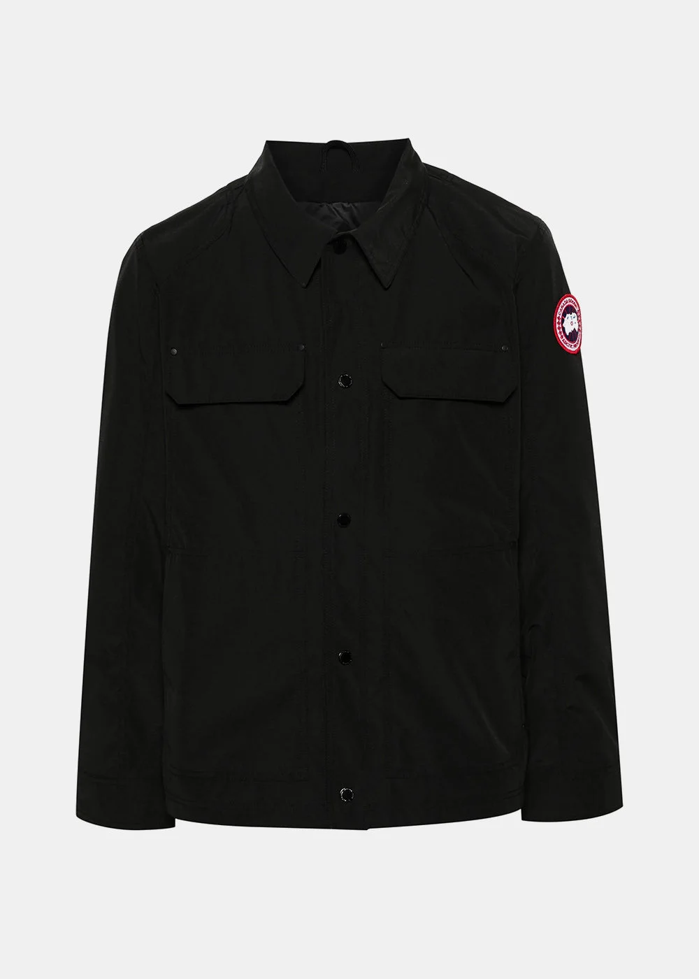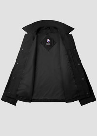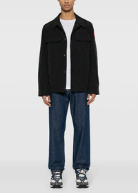 Polyester blend Burnaby Chore jacket in black. Logo patch at the sleeve Classic collar Front press-stud fastening Long sleeves with press-stud fastening cuffs Two chest flap pockets Two side zip-fastening pockets Straight hem Full lining 84% Recycled Polyester 16% Organic Cotton Made in Canada.