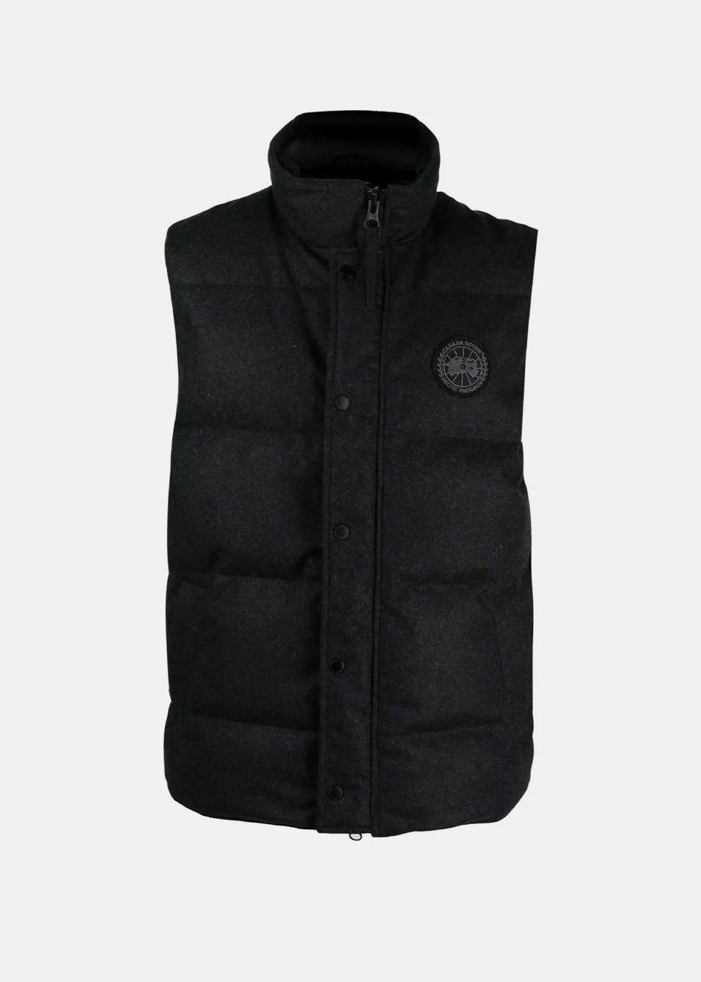 Wool blend Garson Vest in carbon melange. Recycled wool Padded design Logo patch at the chest Funnel neck Front press-stud and zip fastening Long sleeves 72% Recycled Wool 23% Polyamide 5% Other fibres Made in Canada.