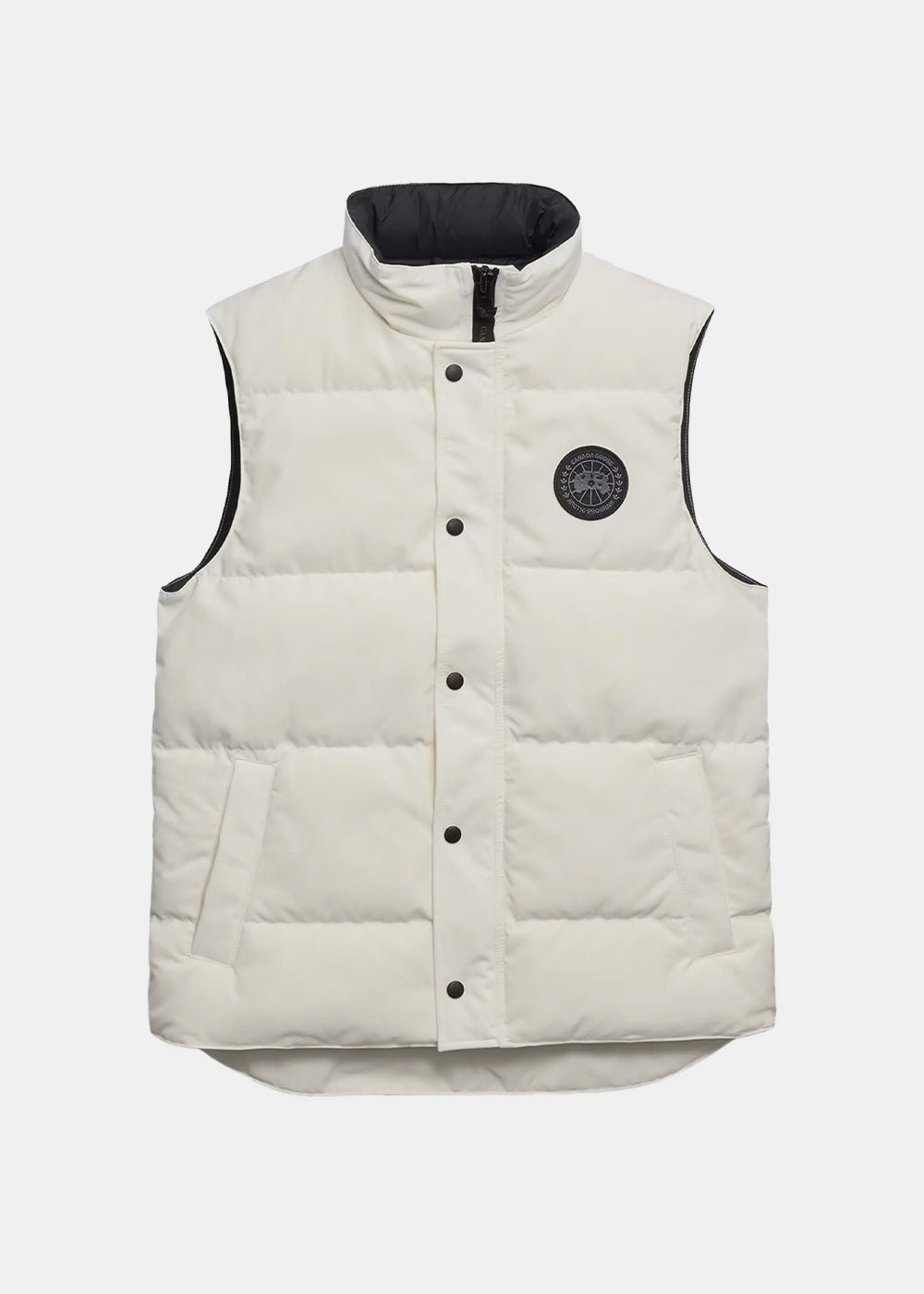 Garson quilted logo-patch gilet in off white. Quilted design Button and zip fastening High collar Logo patch 85% Recycled Polyester 15% Organic Cotton Made in Canada.