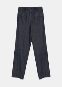Non-stretch denim jeans in indigo. Elasticized waistband Three-pocket styling Zip-fly Cargo pocket at lower outseams 100% Cotton Made in Tunisia.