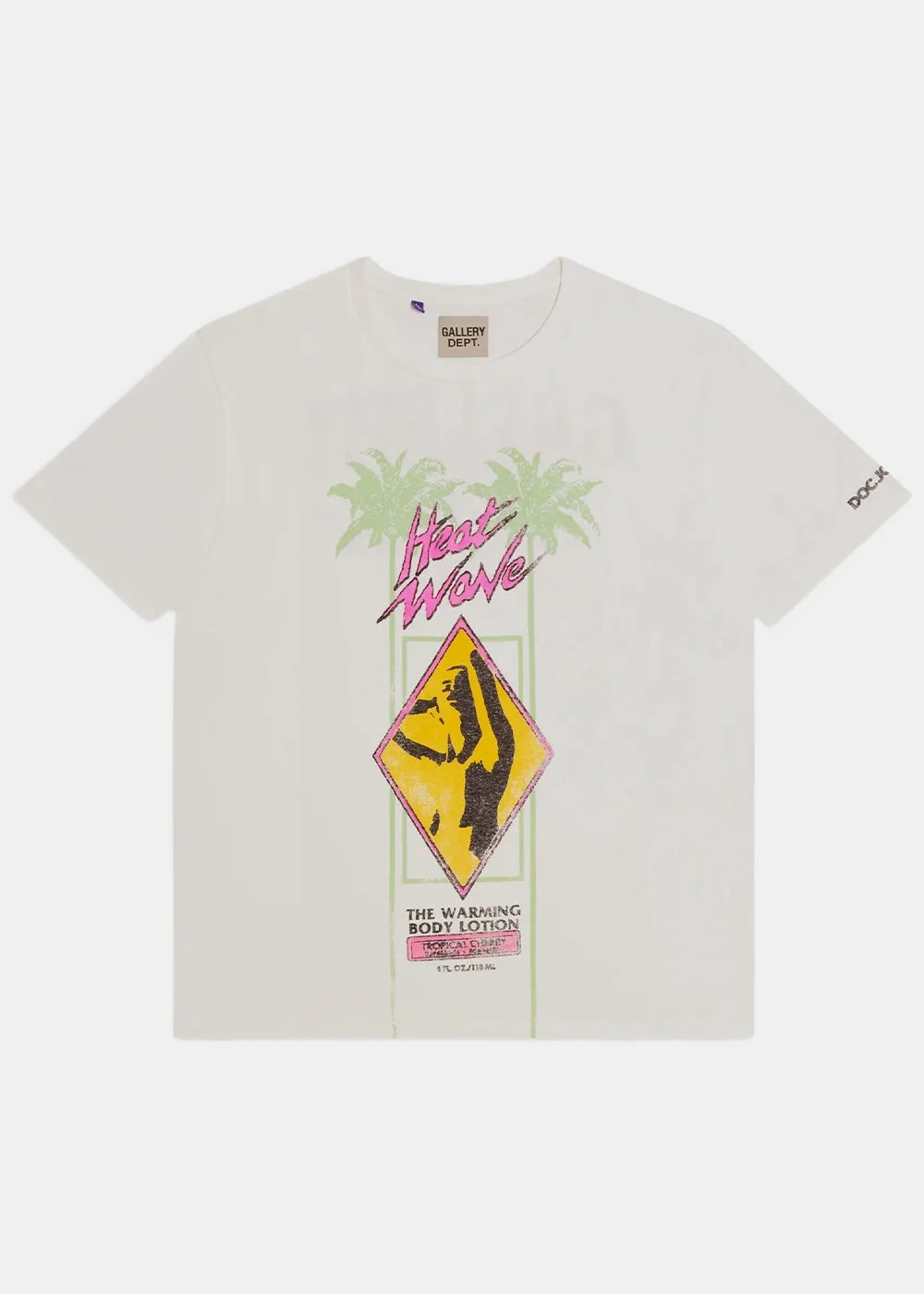 Cotton graphic-print t-shirt in light archival white. Heat Wave print Gold-tone glittered logo Short sleeves Crew neck 100% Cotton Made in United States.
