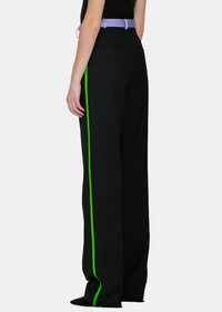 Pants in black featuring pleats at front. Neon orange waistband with zip-fly and belt loops. Four-pocket styling. Side seam tape in mint green. Main: 100% Fleecewool; 100% Silk. Lining: 63% Cotton, 37% Silk. Made in Bulgaria. 203 1406 202 099