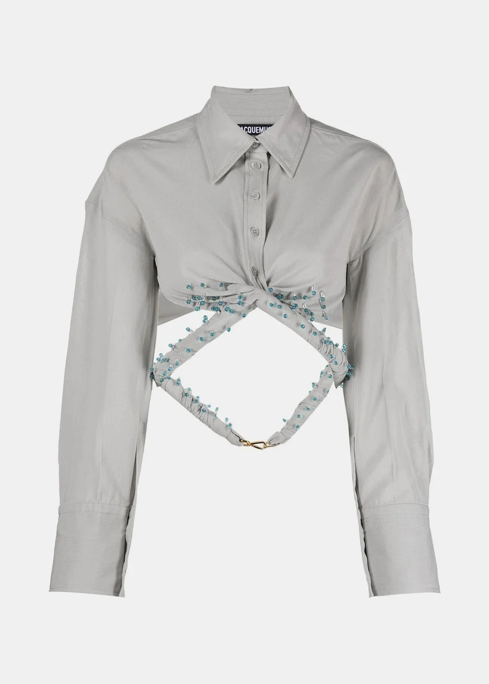 Long-sleeved mini-shirt with beaded waist. Fitted shirt cut under the bust. Classic collar. Hem with crossed straps, quilted and embroidered with pearls. Mother-of-pearl buttons. Carabiner and D-ring in gold metal. 100% Viscose. Made in Madagascar.