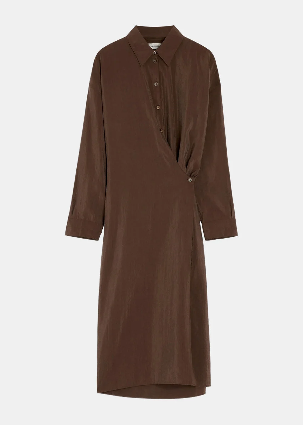 Silk blend twisted dress in brunette. Shirt collar Long sleeves Buttoned asymmetrical closure Wrap-style tie Gathers at the back 76% Silk 24% Polyamide Made in Italy.