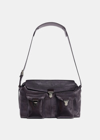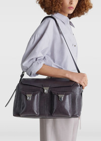 Glossy vegetable leather weekend gear bag in dark mink. Elongated design Adjustable shoulder strap Metal clip fasteners Zipped pocket 100% Calf Leather Made in Spain.