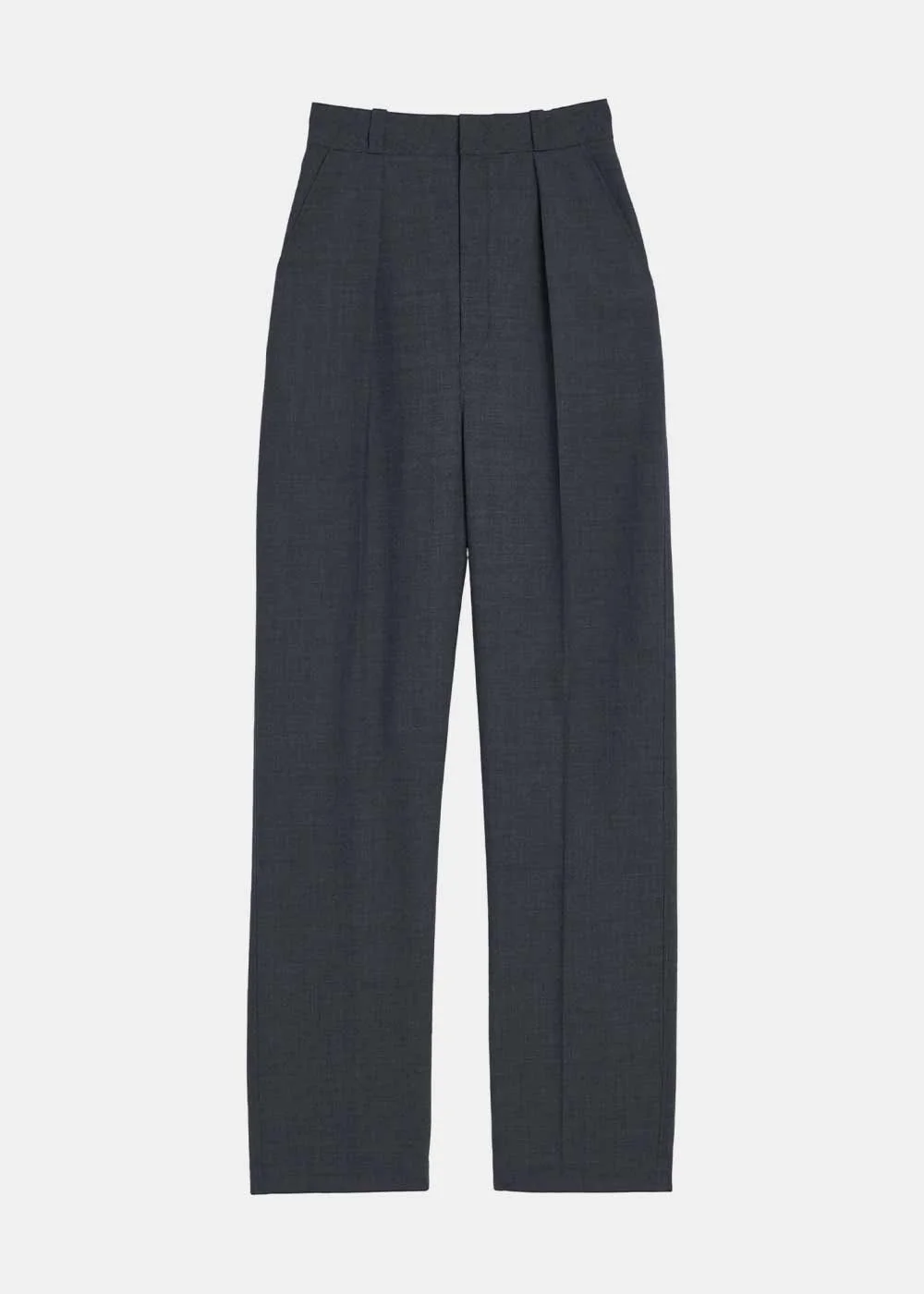 Wool dropped crotch pants in grey melange. Straight fit Pleats on the leg Low crotch Welt side pockets Welt back pockets Zip fly and hook 100% Wool Made in Romania.