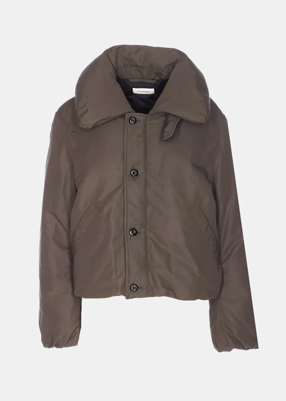 Bubble-collar puffer jacket in dark espresso. Button closure Bubble collar Quilted design Welt pockets 44% Polyamide 32% Linen/Flax 24% Cotton Made in Tunisia.