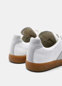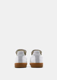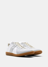 Low-top buffed calf leather sneakers in white featuring classic white stitch at heel. Grey suede trimming throughout Round toe Beige lace-up closure Logo-embossed leather patch at padded tongue Padded collar Tan treaded rubber sole Color: Off White. Upper: 100% Calf Leather Lining: 100% Cotton Sole: 100% Rubber Made in Italy. S58WS0109 P1895 T1016