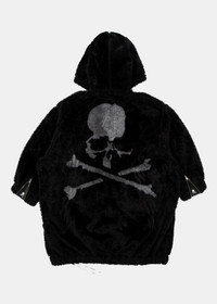 Faux fur long hoodie in black with skull motif to the back. Zip fastening Long sleeves Drawstring hem Fleece texture 100% Polyester Made in Japan.
