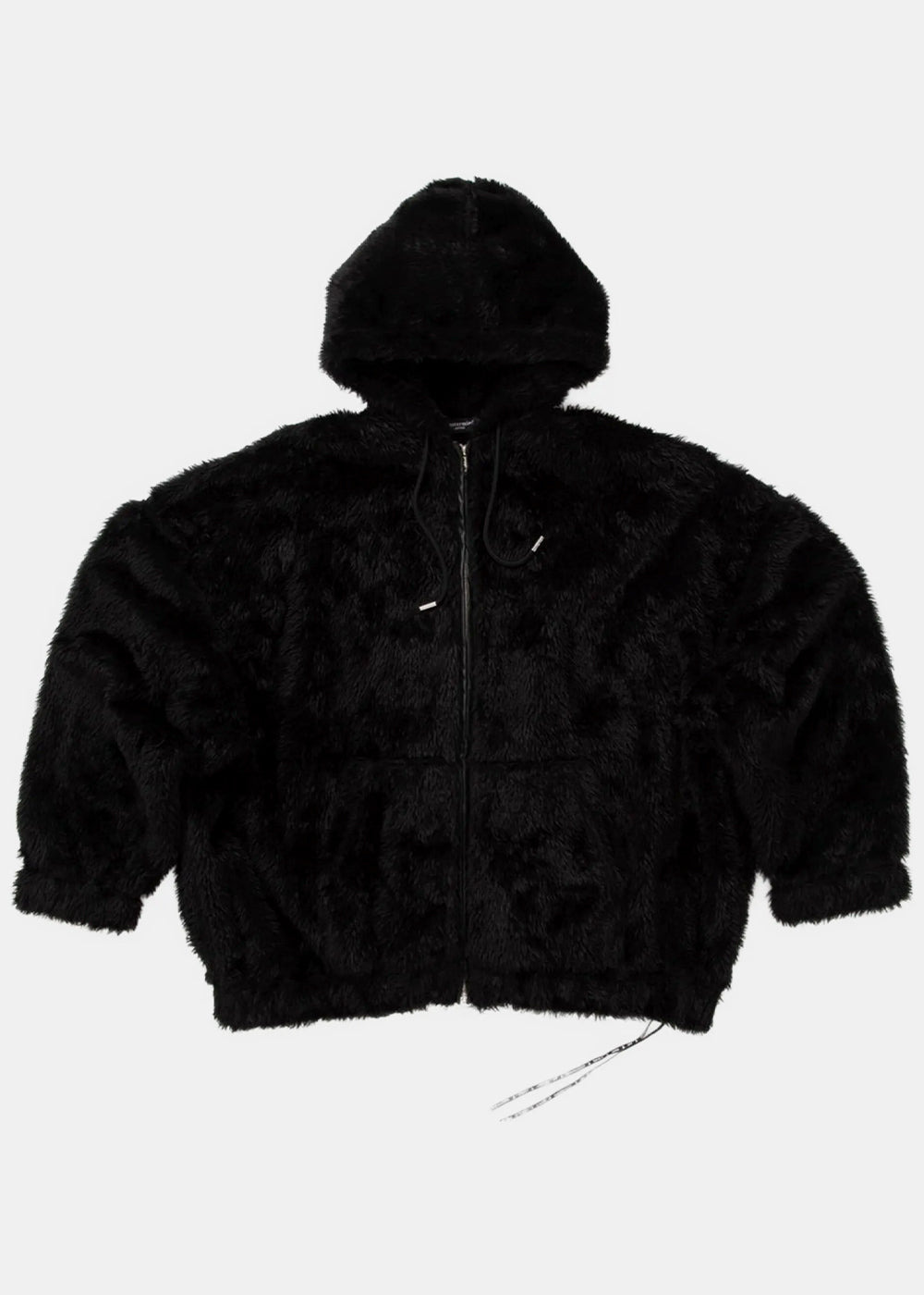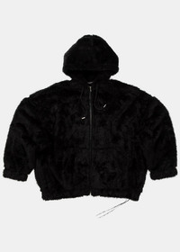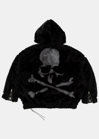 Faux fur Polar Bear hoodie in black. Zip fastening Skull and crossbones print Drawstring hem 100% Polyester Made in Japan.