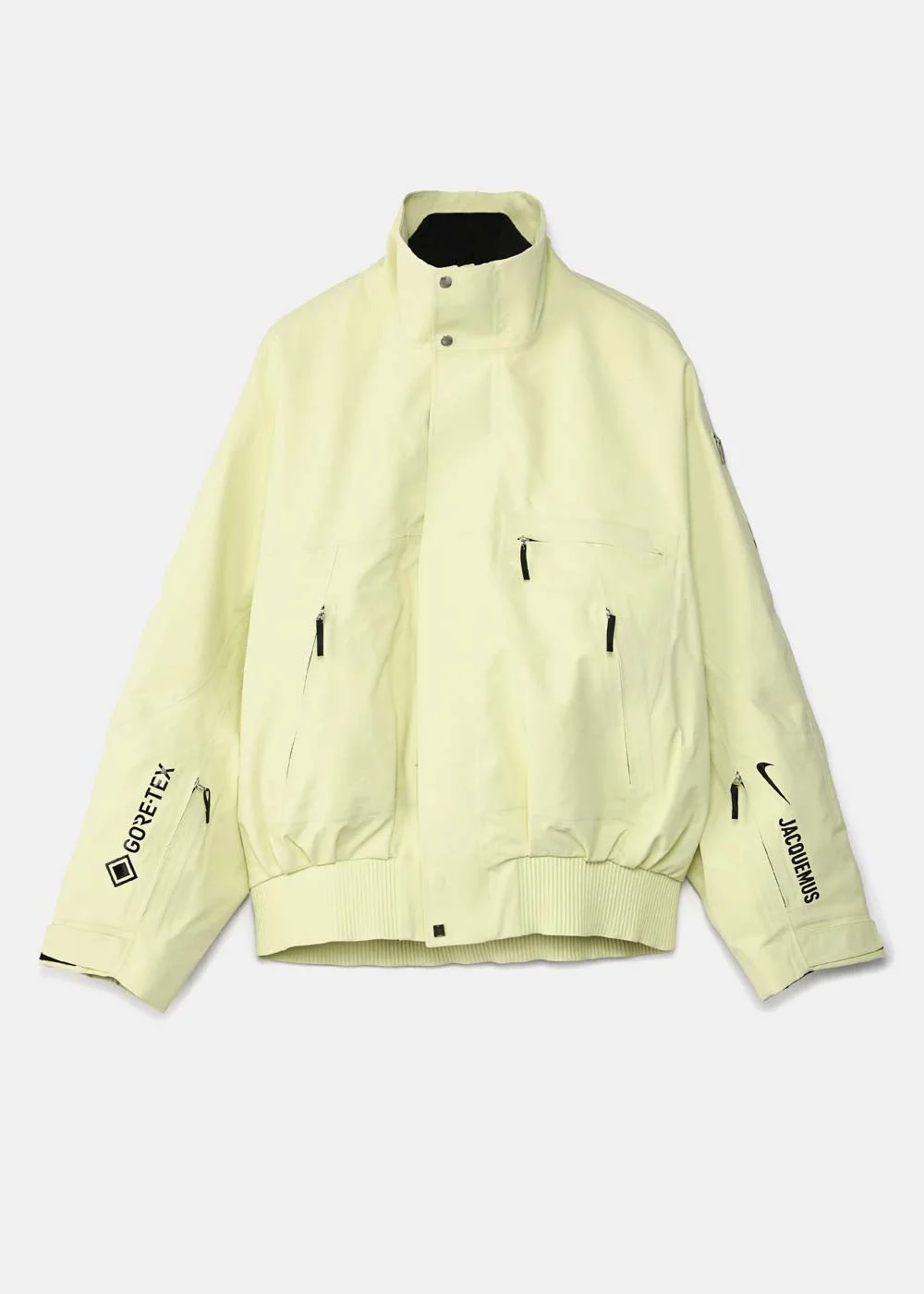Long sleeve Nike jacket in citron tint In collaboration with Jacquemus Triple layer water-proof GORE-TEX material Stand up collar Removable bomber-style inner jacket with PrimaLoft padding 6 zippered pockets and interior patch pockets Tone-on-tone JACQUEMUS logo at back Waterproof zippers Ventilation zippers at underarm Relaxed fit 100% Nylon Made in Vietnam.