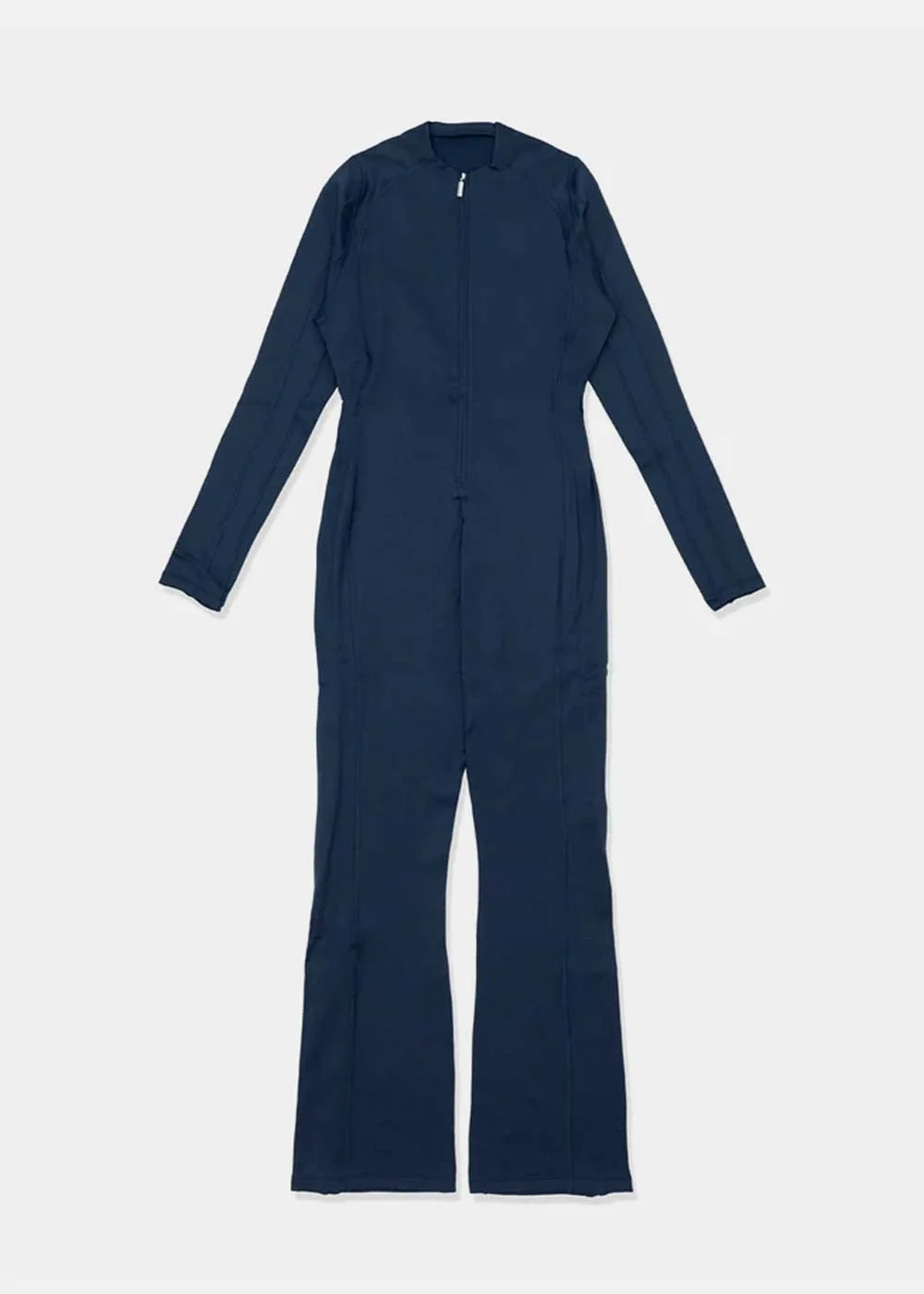 Women's woven jumpsuit in obsidian. Made of soft Stretchy and water-repellent fabric Slim fit Self-bonded neckline and zip guard Flattering design lines keep 63% Nylon 37% Spandex Made in Vietnam.