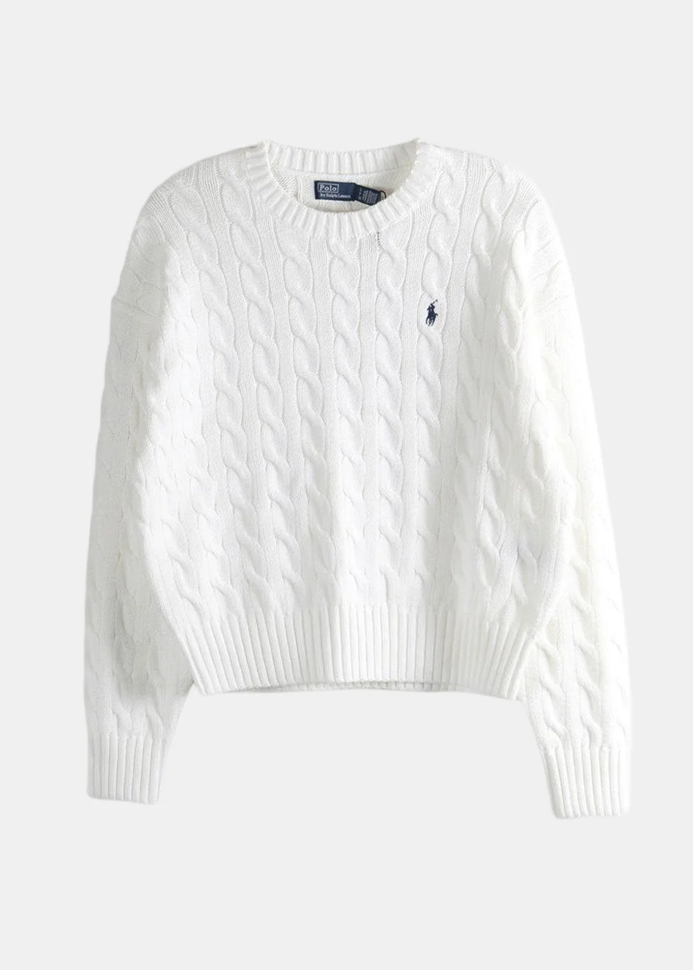 Cable-knit crew-neck sweater in white. Embroidered pony logo 100% Cotton Made in China.