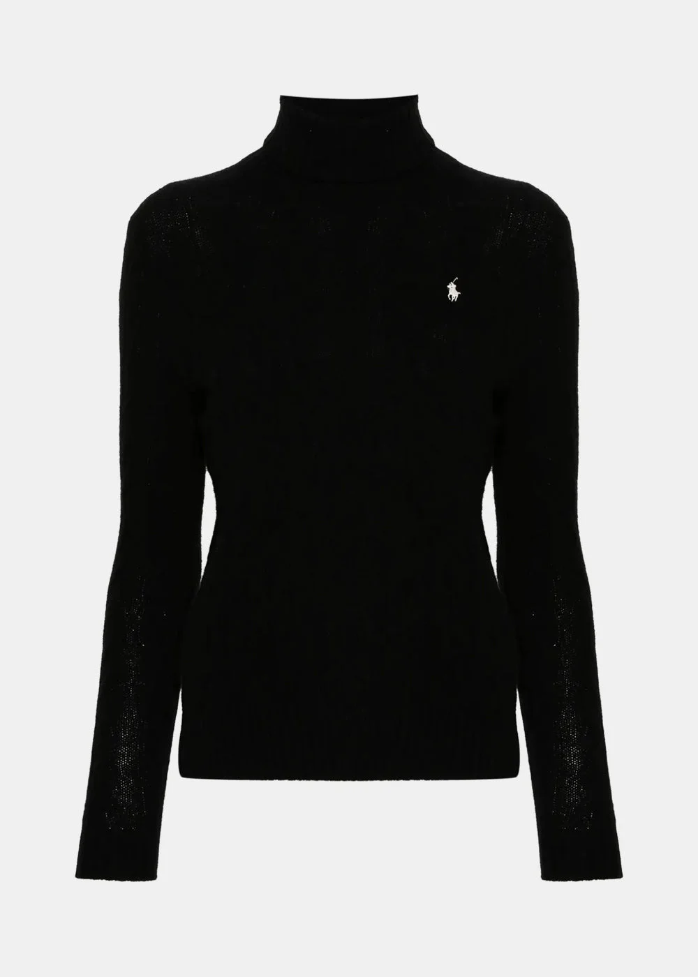 Polo pony-embroidered jumper in polo black. Wool-cashmere blend Cable knit Roll neck Long sleeves Ribbed cuffs and hem Signature polo pony motif embroidery Internal logo tag Straight hem 90% Wool 10% Cashmere Made in China