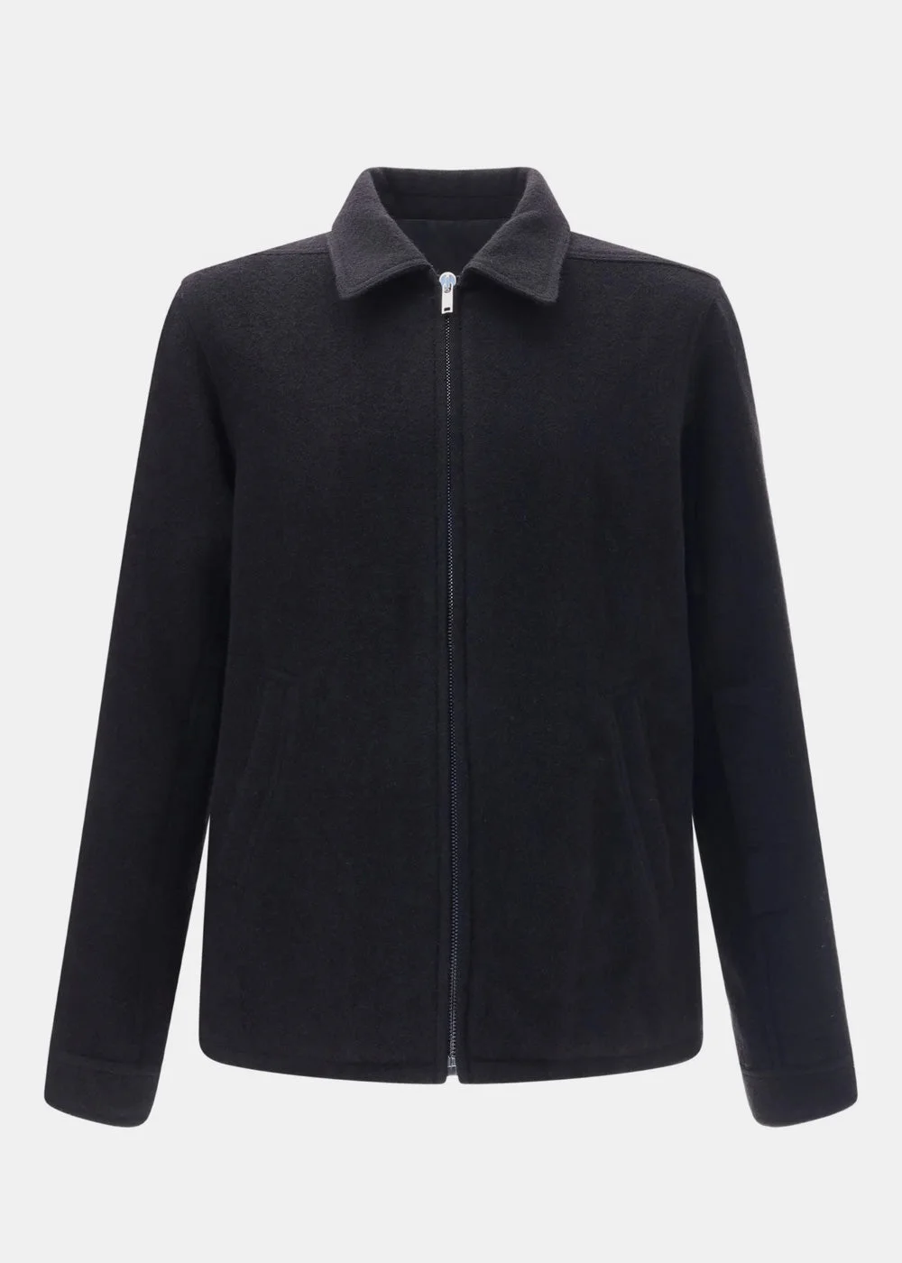 Wool zip-front shirt jacket in black. Pointed collar Zip front fastening Welt pockets Buttoned cuffs 100% Wool Made in Italy.