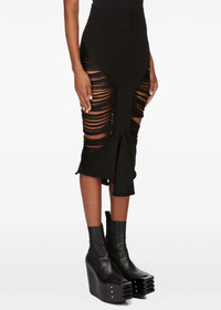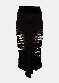 Wool midi skirt in black. Elasticated waistband Pleat detailing Distressed finish Asymmetric hem 100% Wool Made in Italy.