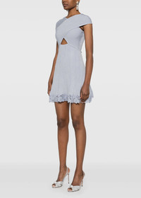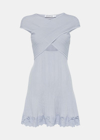 Polyester blend knit lace insert mini dress in blue. Flared skirt Wrap design Cut-out detailing 46% Polyester 41% Viscose 12% Polyamide 1% Elastane Made in China.