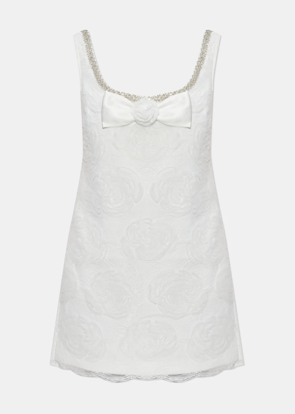 Nylon tulle lace mini dress in white. Rear zip fastening Square neck Sleeveless Bow detailing 100% Polyamide Made in China.