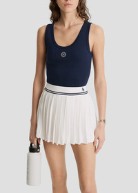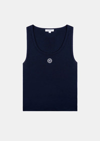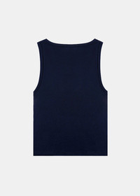 Cotton baby rib tank top in dark navy. Embroidered rubber patch Ribbed collar and armholes Fitted cut 100% Cotton Made in USA.