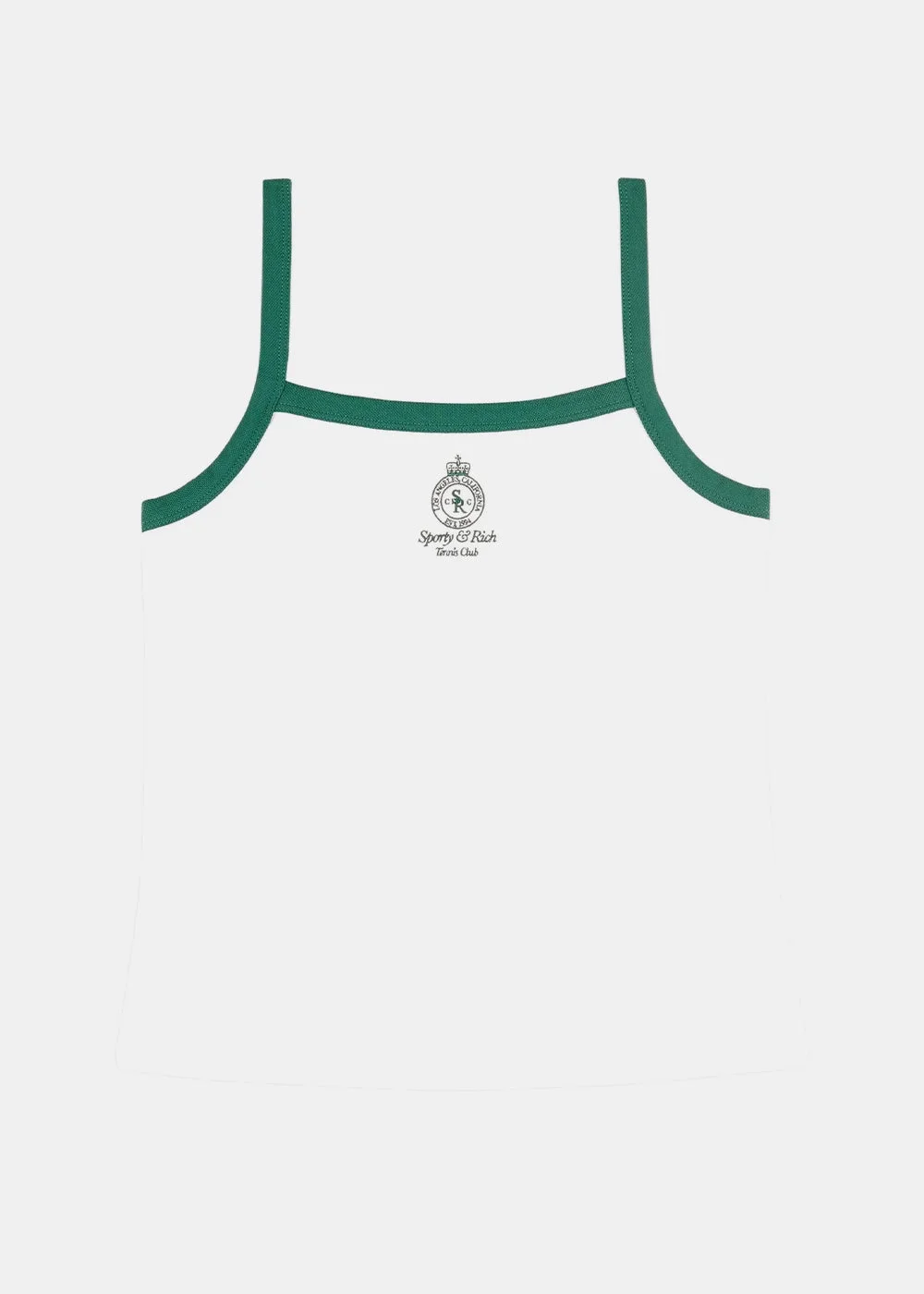 Cotton tennis tank top in white and alpine. Ribbed texture Green trim Square neck Sleeveless Straight hem 97% Cotton 3% Elastane Made in USA.