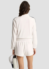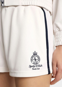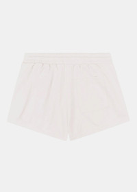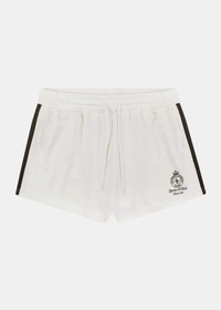 Polyester tennis shorts in white. Embroidered logo Side stripes Elasticated waistband Drawstring fastening 100% Polyester Made in USA.