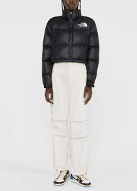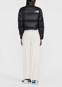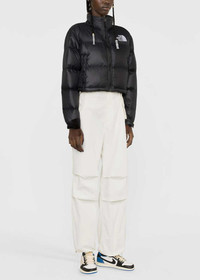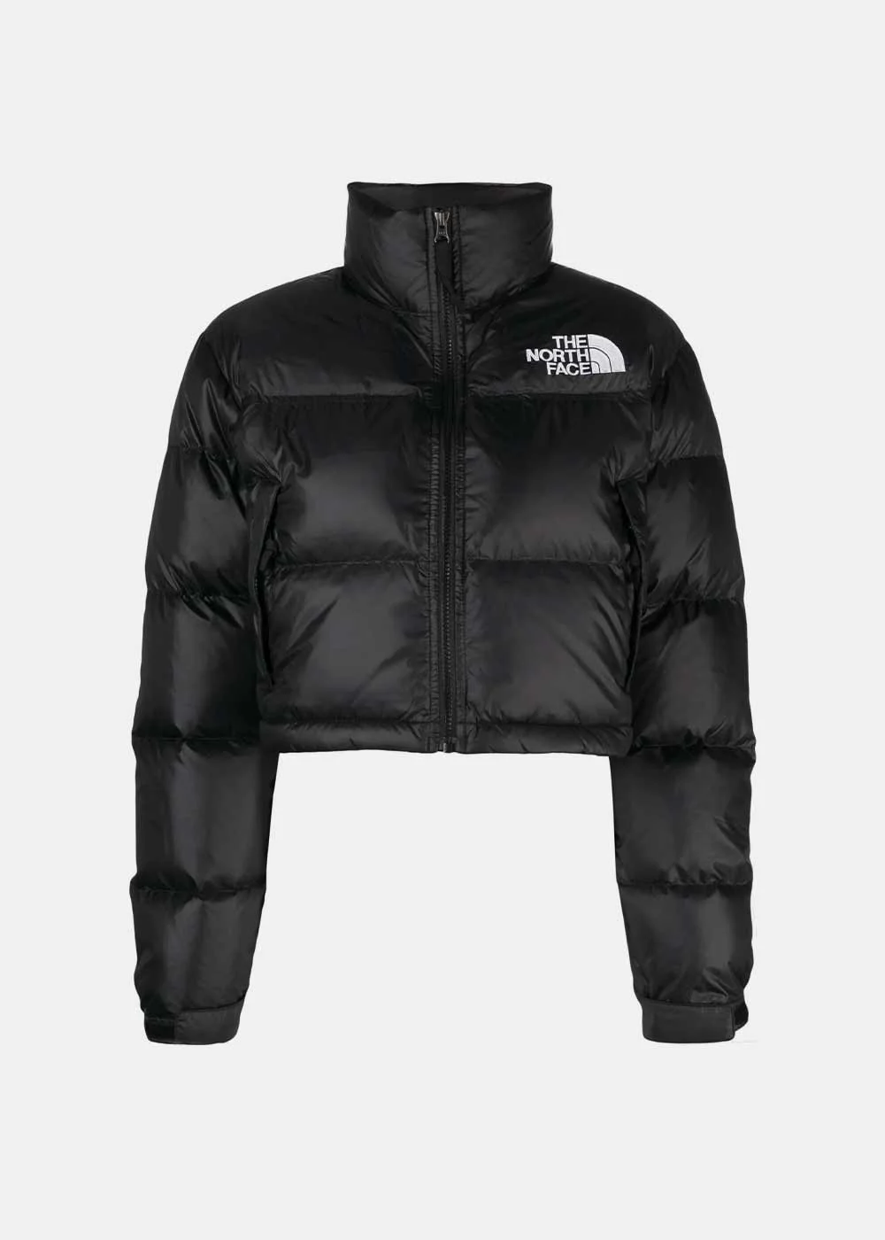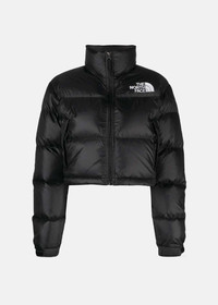 Recycled Nuptse padded cropped jacket in black. Ripstop texture Embroidered logo at the chest Embroidered logo to the rear Down-feather filling Quilted High neck Front zip fastening Long sleeves Two side zip-fastening pockets 100% Recycled Nylon Made in Vietnam.