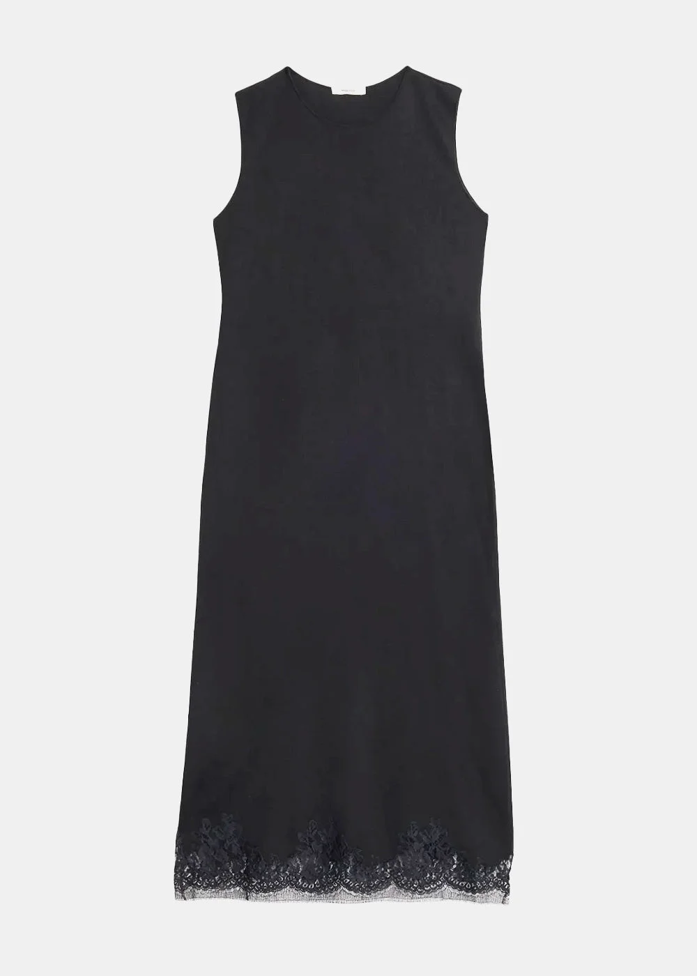 Million lace-trim sleeveless midi dress in black. Dry clean only Unlined Pull-on styling Midweight satin knit fabric 10569-Y475-BLK 100% Silk Made in Italy.