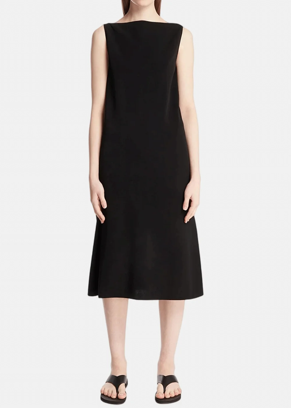 The Row Black Ender Dress. Black technical fabric, sleeveless, ankle-length, slightly flared silhouette, straight neckline. 69% Triacetate 31% Polyester Made in Italy.