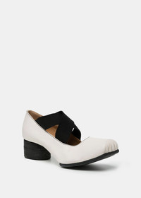 White square-toe ballet pumps in calfskin leather. Fused leather sole and heel. Elasticated cross straps in black at the foot opening. Includes a single branded dust bag. Approx. 4 cm heel. 100% Calf Leather Made in Italy.