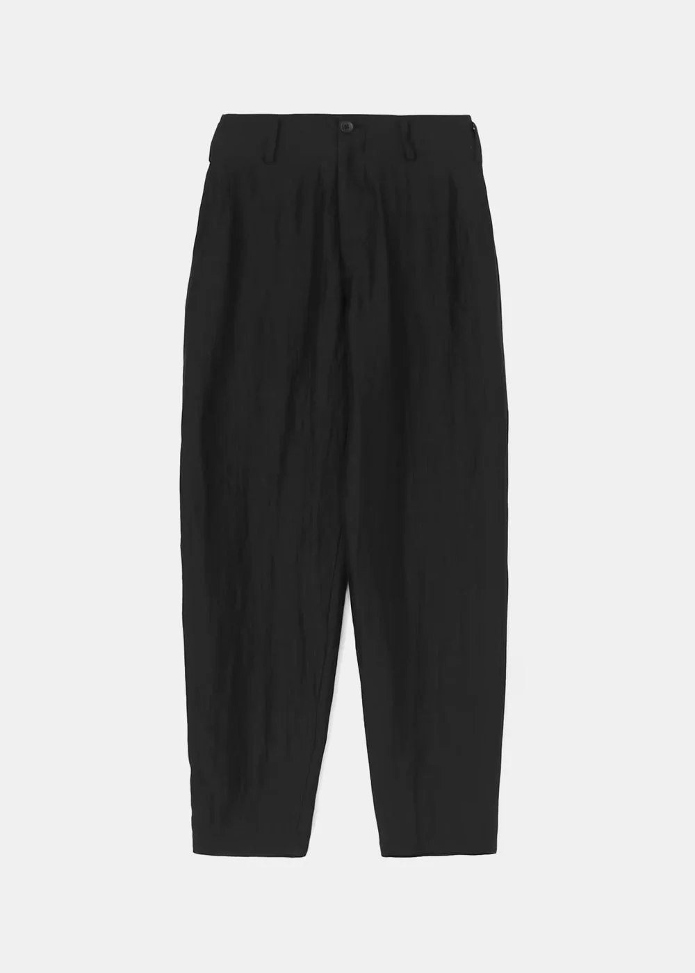 Low-waist cupro pants with moderate luster in black. Belt loops Straight leg Front zip closure 53% Ramie 34$ Cupro 13% Flax Made in Japan.