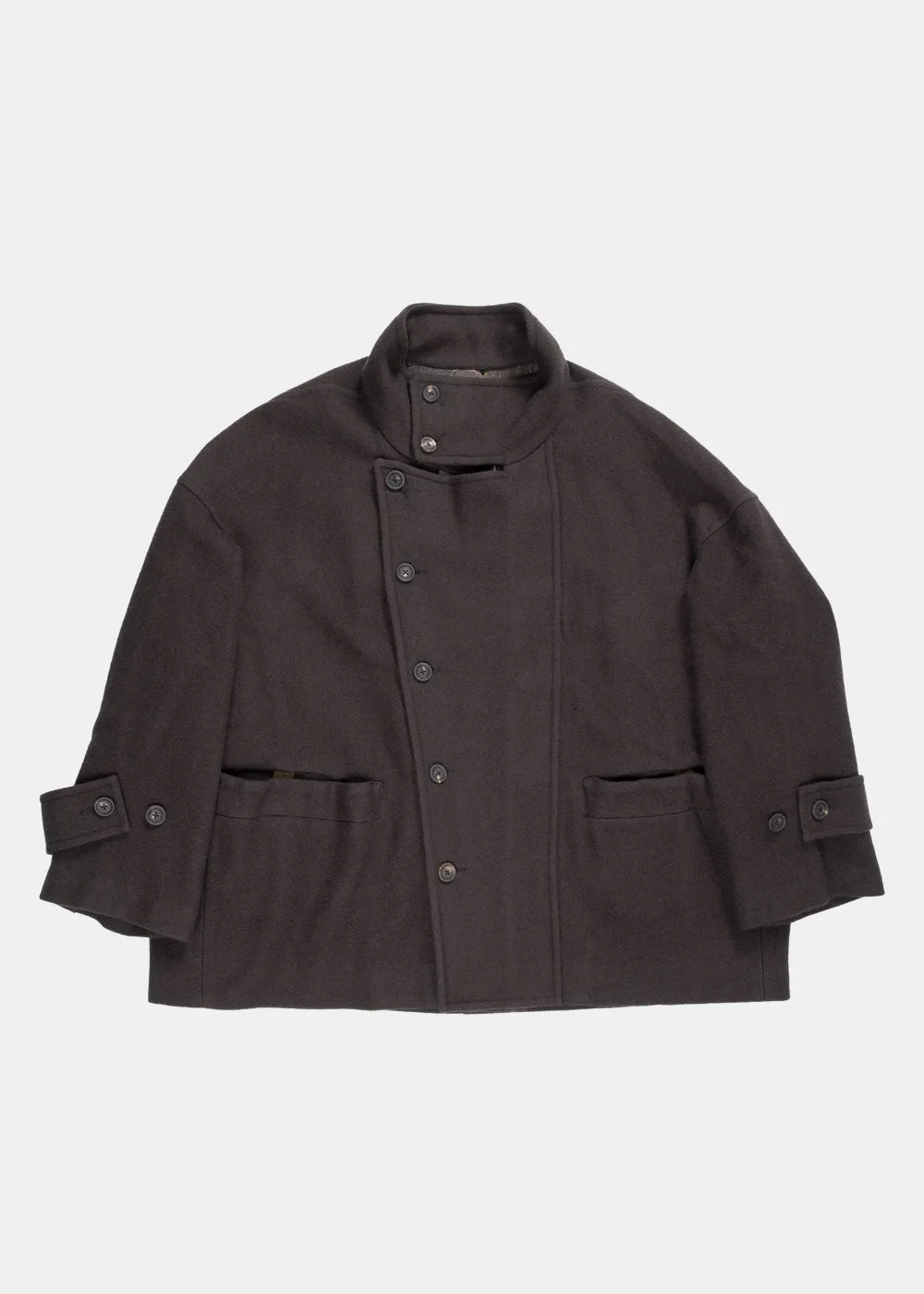 Short coat in brown. Stand collar Front button fastening Flap pockets Buttoned cuffs 100% Cotton Made in China.