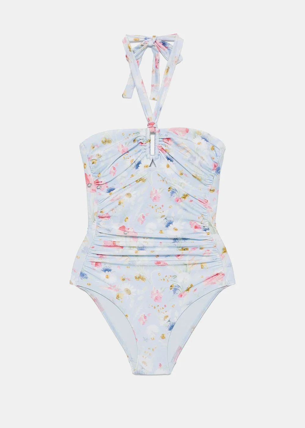 Nylon Lucky Wide Link Swimsuit in blue bouquet floral. Halterneck tie fastening Floral print Partial lining Polyamide 80% Elastane 20% Made in China.
