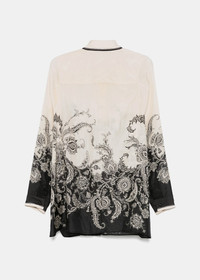 Silk Rhiannon Relaxed Shirt in cream and black floral. Front button fastening Contrasting trim Short side slits 100% Silk Made in China.