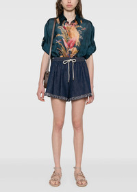 Silk relaxed shirt in dark blue palm floral. Front button fastening Classic collar Short sleeves 100% Silk Made in China.