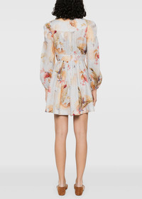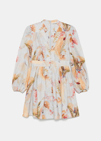Linen Ascension mini dress in light blue palm floral. Front button fastening Flared skirt Leaf print Smocked waist 100% Linen Made in China.
