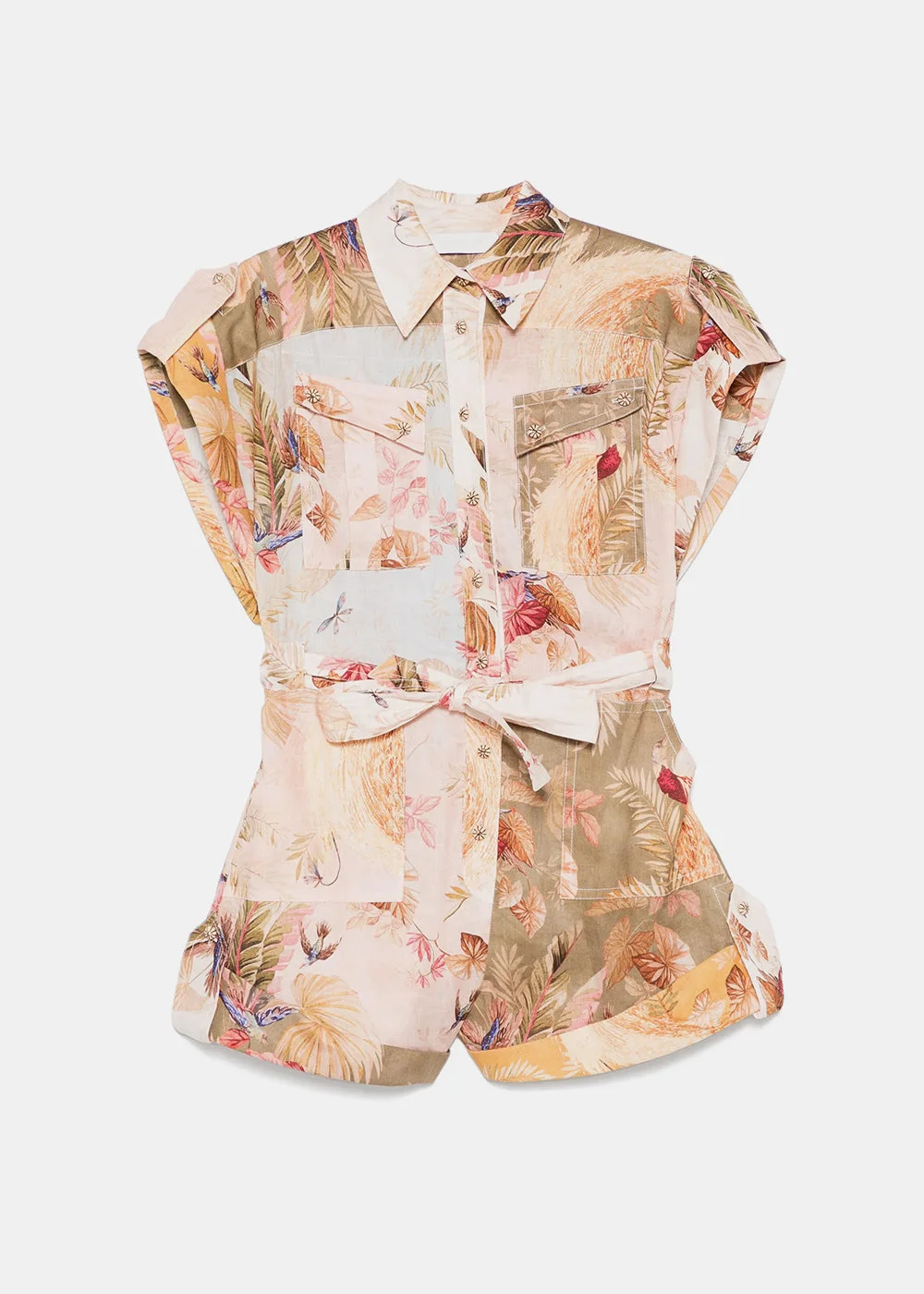 Linen cuffed playsuit in spliced. Front button fastening Two chest flap pockets Two front patch pockets Detachable belt 100% Linen Made in China.