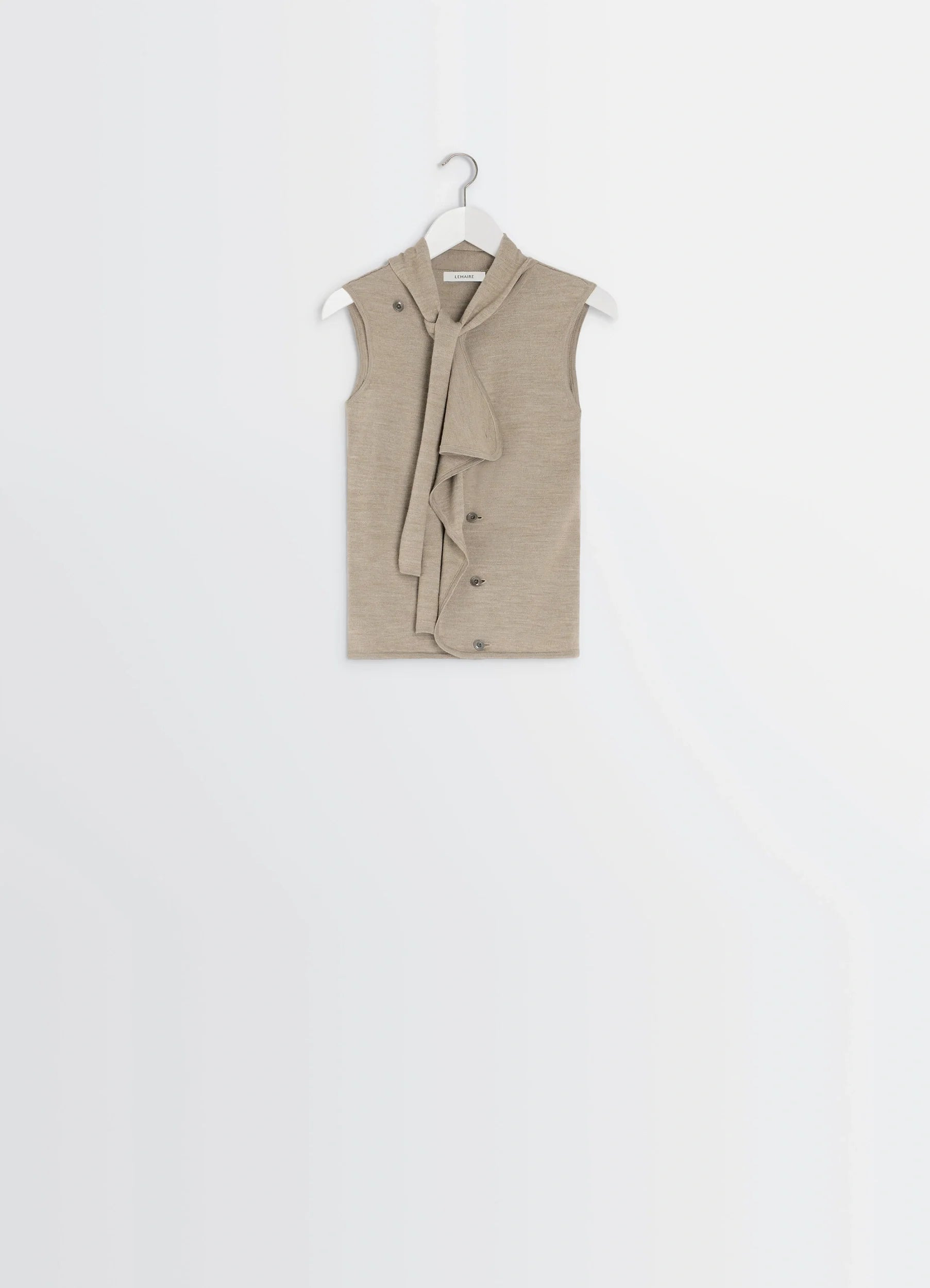 This asymmetrical sleeveless cardigan is part of an evolving, modular wardrobe that reflects Lemaire's love for movement. Featuring panels to tie or button, it is knitted in a blended merino wool that is both dry and soft. The model is 177 cm and is wearing a size 36 (S). This asymmetrical sleeveless cardigan is part of an evolving, modular wardrobe that reflects Lemaire's love for movement. Featuring panels to tie or button, it is knitted in a blended merino wool that is both dry and soft. The model is 177 cm and is wearing a size 36 (S). DETAILS Asymmetrical sleeveless cardigan in merino wool blend Fitted cut Crewneck Integrated scarf Asymmetrical front closure for buttoning and draping Lacquered buttons Rib-knit trim Made in Portugal Style : TO1485 LK087 Asymmetrical sleeveless cardigan in merino wool blend Fitted cut Crewneck Integrated scarf Asymmetrical front closure for buttoning and draping Lacquered buttons Rib-knit trim Made in Portugal Style : TO1485 LK087 CARE Main Material: 50% Acrylic 50% Wool Hand wash Do not bleach Do not tumble dry Cool ironing Soft dry clean Dry flat Main Material: 50% Acrylic 50% Wool Hand wash Do not bleach Do not tumble dry Cool ironing Soft dry clean Dry flat