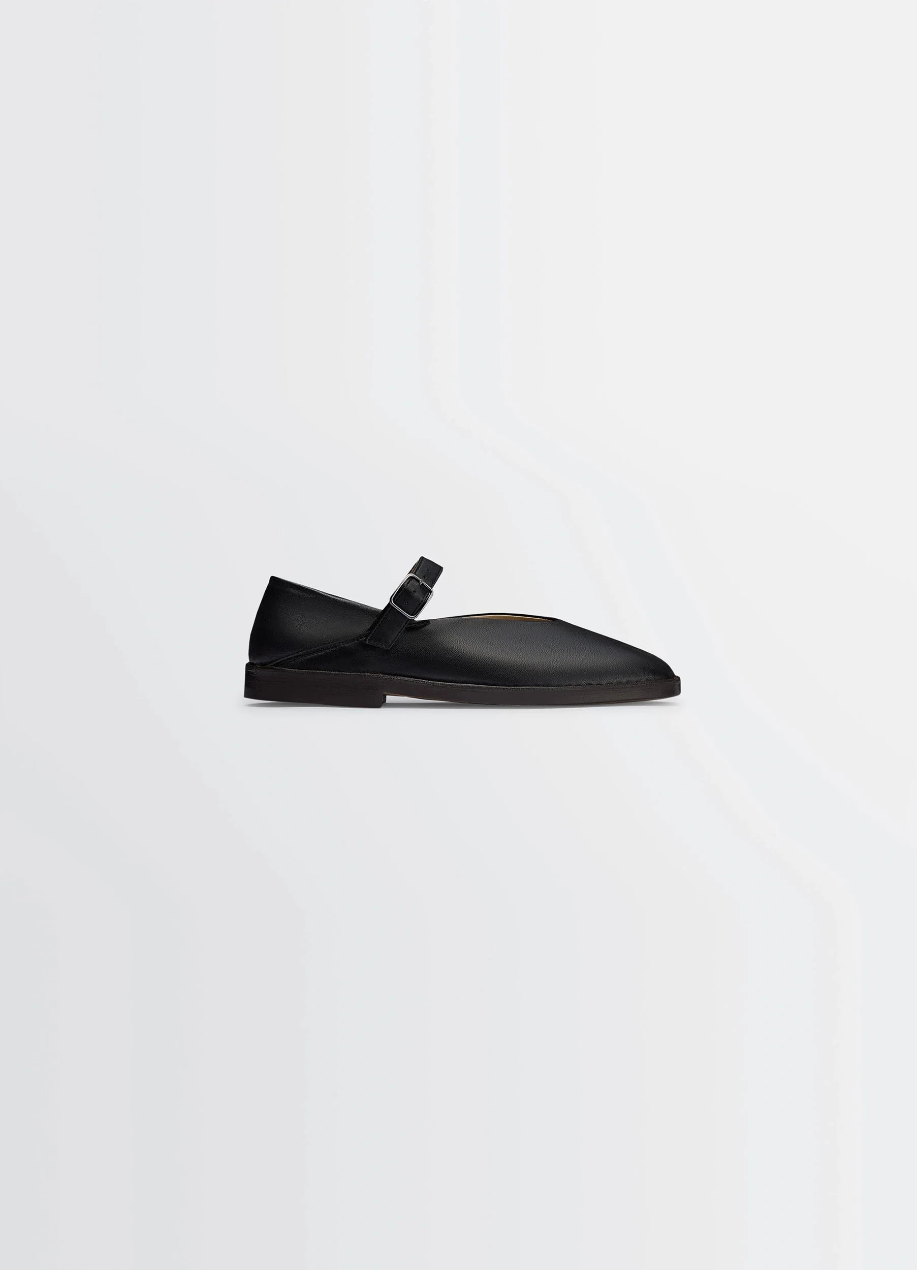 These shoes are made of lamb nappa leather with a shiny finish. Their ballerina inspired shape has a rounded square toe, streamlined cutouts separating the vamp and the heel. This updated style features a strap with a metal buckle. The edges are creased, securing them from wear and tear. Their thick leather soles are welted for a more lasting wear. DETAILS Leather lining and sole Creased edges Strap with metal buckle 2 cm heel Made in Portugal Style : FO0015 LL0023 FABRICS & CARE Main Material: 100% Lambskin Main Lining: 100% Calf Leather If exposed to water or high humidity, dry your shoes well with an absorbent cloth and let them air dry before storing them. Care: Smooth leather: Use a soft cloth and apply a measured amount of uncolour milk or cream. Suede leather: Brush lightly with a sponge or special suede cloth.