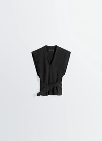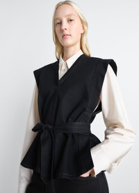 This Chasuble returns the LEMAIRE wardrobe this season in a new material. It is made of a denim with a visible twill weave and a deep black wash. Ideal for layering, the versatile style features a V-neck with binding. At the armholes, an applied band becomes a slit from the waist down, facilitating movement. On the back, a removable belt with central stitching and pointed waistband allows the garment to be tightened. The Model is 176cm / 5' 9½'' ft and is wearing a size 36 (S). This Chasuble returns the LEMAIRE wardrobe this season in a new material. It is made of a denim with a visible twill weave and a deep black wash. Ideal for layering, the versatile style features a V-neck with binding. At the armholes, an applied band becomes a slit from the waist down, facilitating movement. On the back, a removable belt with central stitching and pointed waistband allows the garment to be tightened. The Model is 176cm / 5' 9½'' ft and is wearing a size 36 (S). DETAILS Chasuble in black denim - Boxy fit - Cropped cut - V-neck - Removable belt - Side slits Made in Morocco Style: OT0011 LD1071 Chasuble in black denim - Boxy fit - Cropped cut - V-neck - Removable belt - Side slits Made in Morocco Style: OT0011 LD1071 CARE Main material: 100% cotton Soft wash 30° Do not bleach Do not tumble dry Cool ironing Soft dry clean Wash upside down Main material: 100% cotton Soft wash 30° Do not bleach Do not tumble dry Cool ironing Soft dry clean Wash upside down