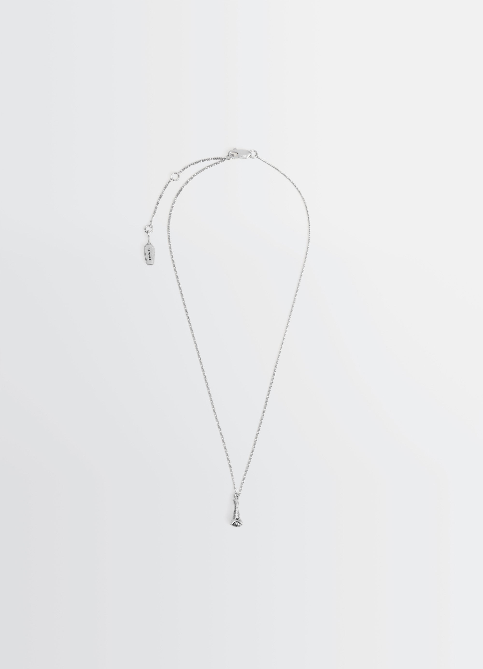 Inspired by the delicate shape of cloves, this pendant necklace is crafted from hammered and patinated brass, a unique finish with a shiny, aged effect. This jewelry, with its raw, handcrafted touch, is equally suited to everyday wear or an elegant alternative for evening. DETAILS Clove pendant necklace in hammered and patinated silver-plated brass Thin chain Clove-shaped pendant Adjustable length with rings Spring clasp Plaque with engraved Lemaire logo Made in Portugal Style: JW0132 LO036 FABRICS & CARE Main material: 100% brass Be careful not to expose your jewellery to perfumes, detergents, and remove it when exposed to water. To clean and shine them, you can use a soft cloth.