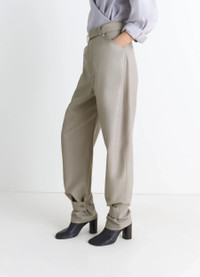 These curved tailored pants are made from a tropical wool blend fabric. Oversized in cut, they reinterpret the world of traditional suiting and represent Lemaire's approach to singular elegance. The model is 177 cm tall and is wearing a size 36 (S). These curved tailored pants are made from a tropical wool blend fabric. Oversized in cut, they reinterpret the world of traditional suiting and represent Lemaire's approach to singular elegance. The model is 177 cm tall and is wearing a size 36 (S). DETAILS Curved tailored pants in tropical wool blend Straight cut Belt loops at the waistband Matching removable belt with metal bucket Closure with hooks, buttons, and hidden zipper Italian side pockets Welted pockets, including one buttoned at the back Adjustable model with button tabs at the ankles < Made in Portugal Style : PA1223 LF414 Curved tailored pants in tropical wool blend Straight cut Belt loops at the waistband Matching removable belt with metal bucket Closure with hooks, buttons, and hidden zipper Italian side pockets Welted pockets, including one buttoned at the back Adjustable model with button tabs at the ankles < Made in Portugal Style : PA1223 LF414 CARE Main Material: 55% Polyester 45% Wool Main Lining: 100% Cotton Do not wash Do not bleach Do not tumble dry Cool ironing Soft dry clean Main Material: 55% Polyester 45% Wool Main Lining: 100% Cotton Do not wash Do not bleach Do not tumble dry Cool ironing Soft dry clean