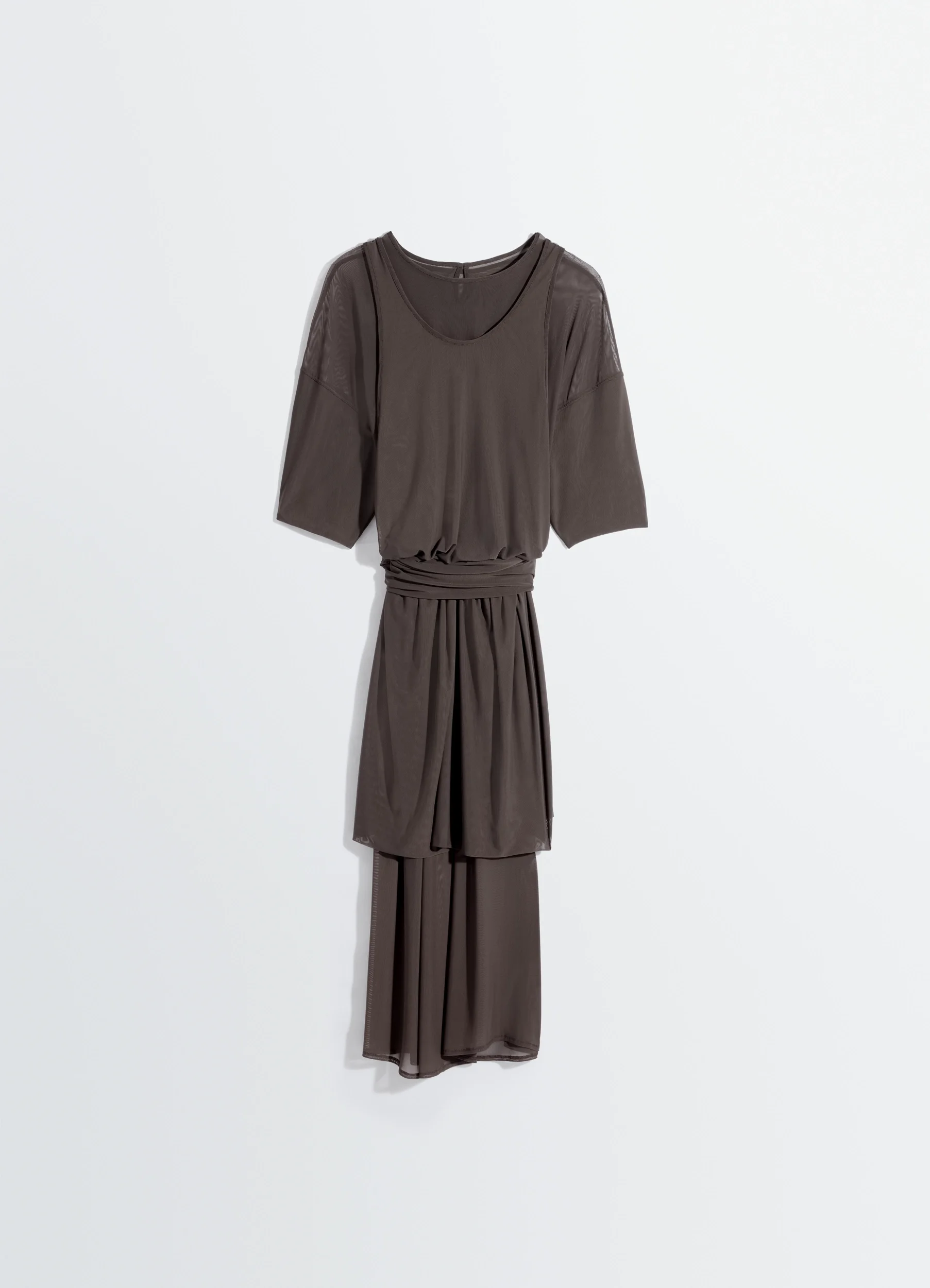 Delicacy is highlighted through sophisticated fluidity in this dress that plays with volumes, lengths, and contrasts. Cut from transparent mesh, it features draping that sits low on the waist for a light, elegant two-in-one effect. The model is 187 cm tall and wears a size 48 (M). Delicacy is highlighted through sophisticated fluidity in this dress that plays with volumes, lengths, and contrasts. Cut from transparent mesh, it features draping that sits low on the waist for a light, elegant two-in-one effect. The model is 187 cm tall and wears a size 48 (M). DETAILS Double mesh dress Fluid fit Play on volume and lengths Round neckline Short wide sleeves Draped waist detail like a belt Double layered asymmetrical skirt Buttoned keyhole at back Side slits Sheer finish Made in Portugal Style: DR1139 LF1572 Double mesh dress Fluid fit Play on volume and lengths Round neckline Short wide sleeves Draped waist detail like a belt Double layered asymmetrical skirt Buttoned keyhole at back Side slits Sheer finish Made in Portugal Style: DR1139 LF1572 CARE Main fabric: 93% polyamide/nylon, 7% elastane Do not wash Do not bleach Do not tumble dry Cool ironing Soft dry clean Main fabric: 93% polyamide/nylon, 7% elastane Do not wash Do not bleach Do not tumble dry Cool ironing Soft dry clean