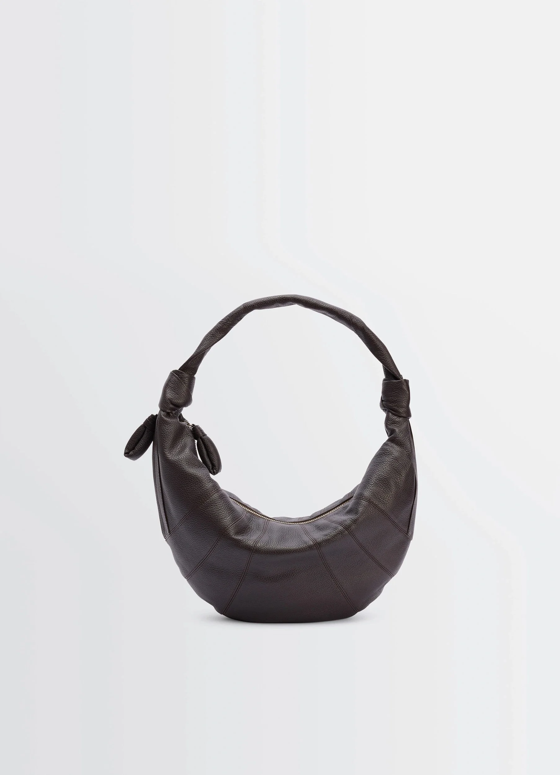 This bag is a new proposition added to the Fortune Croissant family. It is made from a typical fabric used for LEMAIRE accessories: a soft grained leather that is both supple and resistant, giving the bag a delicately textured surface. With its short strap and feminine silhouette, the Fortune Croissant can be carried over the shoulder or by hand for a seamless day-to-night transition. Compact yet spacious, it accommodates one’s essentials with ease. Its folded crescent design is achieved through an assembly of topstitched cut-outs and enriched by the signature elements of the iconic Croissant line. DETAILS - This bag can be worn on the shoulder or carried by hand - Lining in cotton canvas - Height of the shoulder strap: 22cm/8,5in - Length: 42cm/16,5in - Width: 10cm /4in - Depth: 24cm/9,5in - Side knot finishings - Metal zip puller with buckle in matching fabric - Main compartment can hold accessories: large smartphone or small book (11x18cm) - Zipped side pocket can hold small accessories: card holder, Airpods Pro 2 case, wallet or key - Internal patch pocket can hold small accessories - Embossed LEMAIRE logo Made in Spain Style: BG0071 LL0018 FABRICS & CARE Main Fabric: 100% Cow Main Lining: 100% Cotton Do not wash Do not bleach Do not tumble dry Do not iron Professional leather clean only